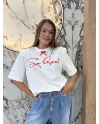 Stylowy T-shirt oversize od La Milla z napisem „So luxe!” i uroczą kokardką przy dekolcie 🎀 Idealny do codziennych, kobiecych stylizacji – wygodny, a jednocześnie wyjątkowy 💕