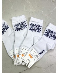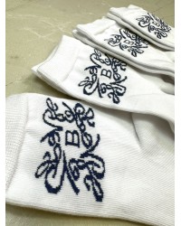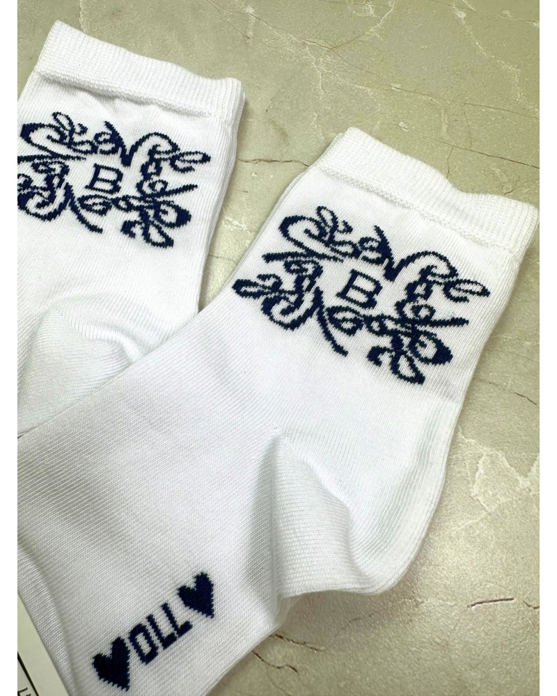 Białe skarpetki z granatowym haftem B 🌀 – klasyka z nutą elegancji.