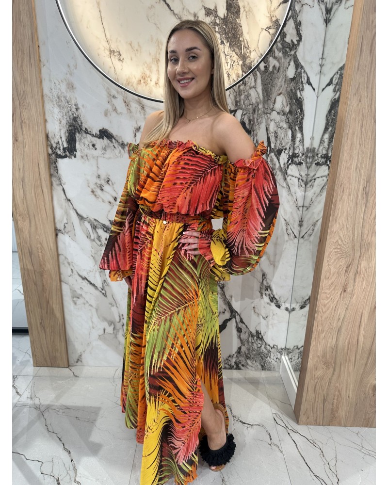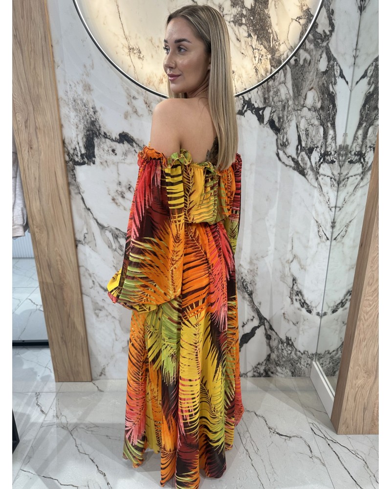 Zjawiskowa sukienka maxi By o la la... to kwintesencja kobiecości i lekkości  Jej romantyczny fason z efektownym, rozkloszowanym dołem i zwiewnym materiałem tworzy bajeczny look – idealny na wakacje, letnie uroczystości czy sesje zdjęciowe. Elastyczna góra pięknie podkreśla dekolt i ramiona, a wiązanie w talii pozwala dopasować krój do sylwetki