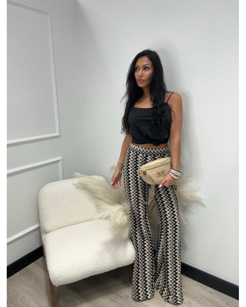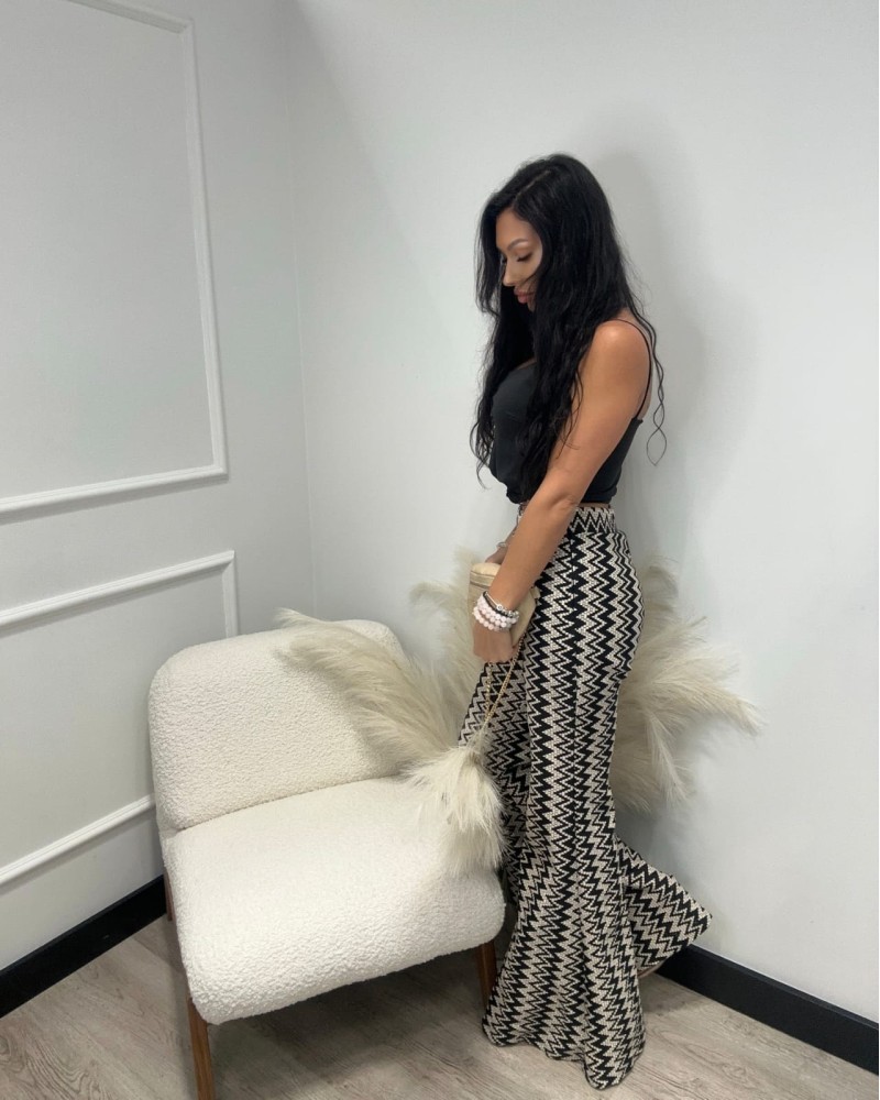 Te wzorzyste spodnie to must-have sezonu!  Ich efektowny, geometryczny print przyciąga spojrzenia, a szerokie nogawki zapewniają swobodę ruchu i maksymalny komfort.