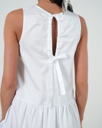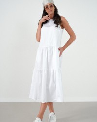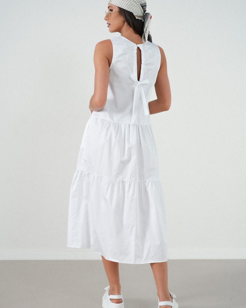 Sukienka midi o swobodnym kroju to doskonały wybór dla kobiet ceniących połączenie minimalizmu i wygody Bez rękawów, z delikatnym rozkloszowaniem na dole – zapewnia pełen komfort noszenia i pięknie układa się w ruchu