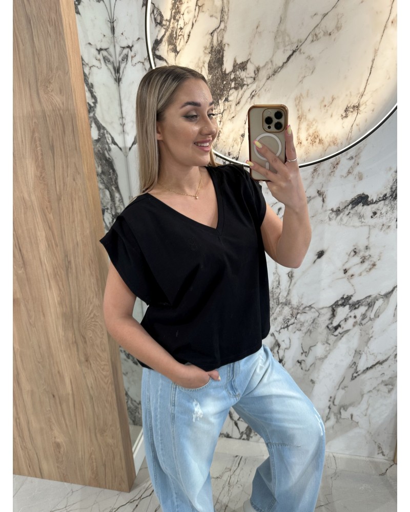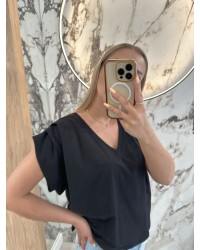 V-dekolt pięknie podkreśla szyję, a krótki rękaw dodaje lekkości.
