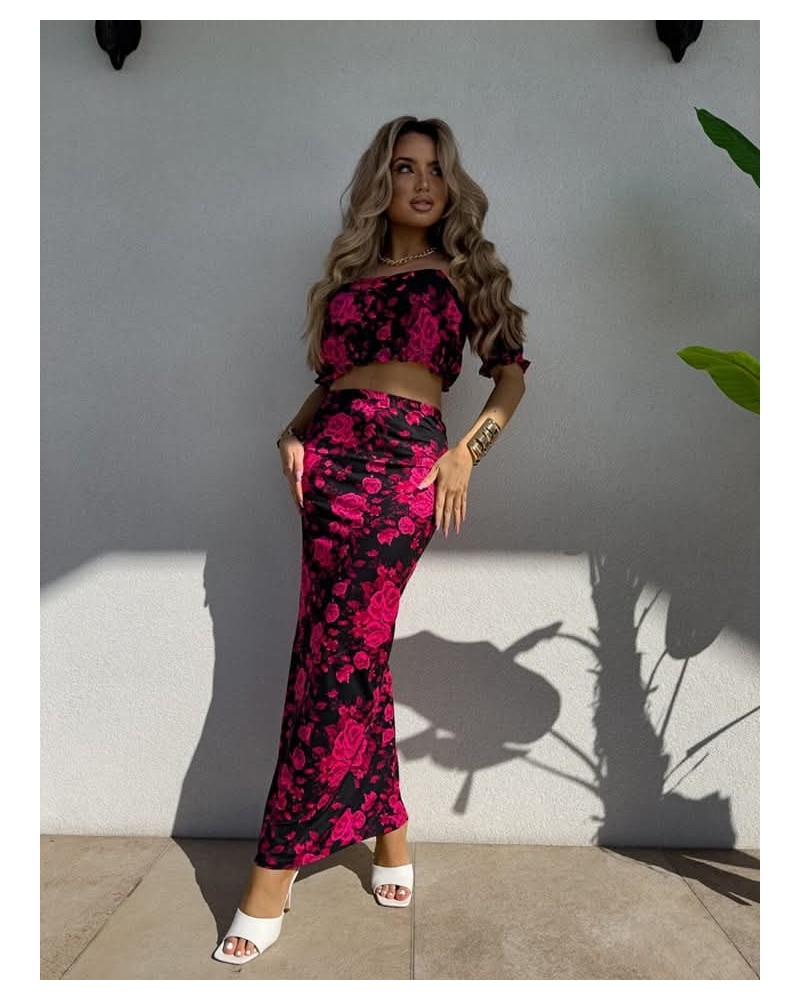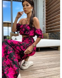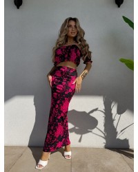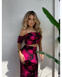 Ten wyjątkowy komplet damski to połączenie elegancji i zmysłowości . Bluzka z odkrytymi ramionami i efektownym dekoltem pięknie podkreśla sylwetkę, a dopasowana spódnica z wysokim stanem dodaje kobiecego uroku. Kwiatowy wzór sprawia, że stylizacja nabiera romantycznego i wyrazistego charakteru