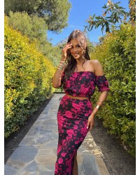Zjawiskowy komplet damski z hiszpańskim dekoltem i kwiatowym wzorem  Idealny na wyjątkowe okazje – kobiecy, elegancki i przyciągający spojrzenia