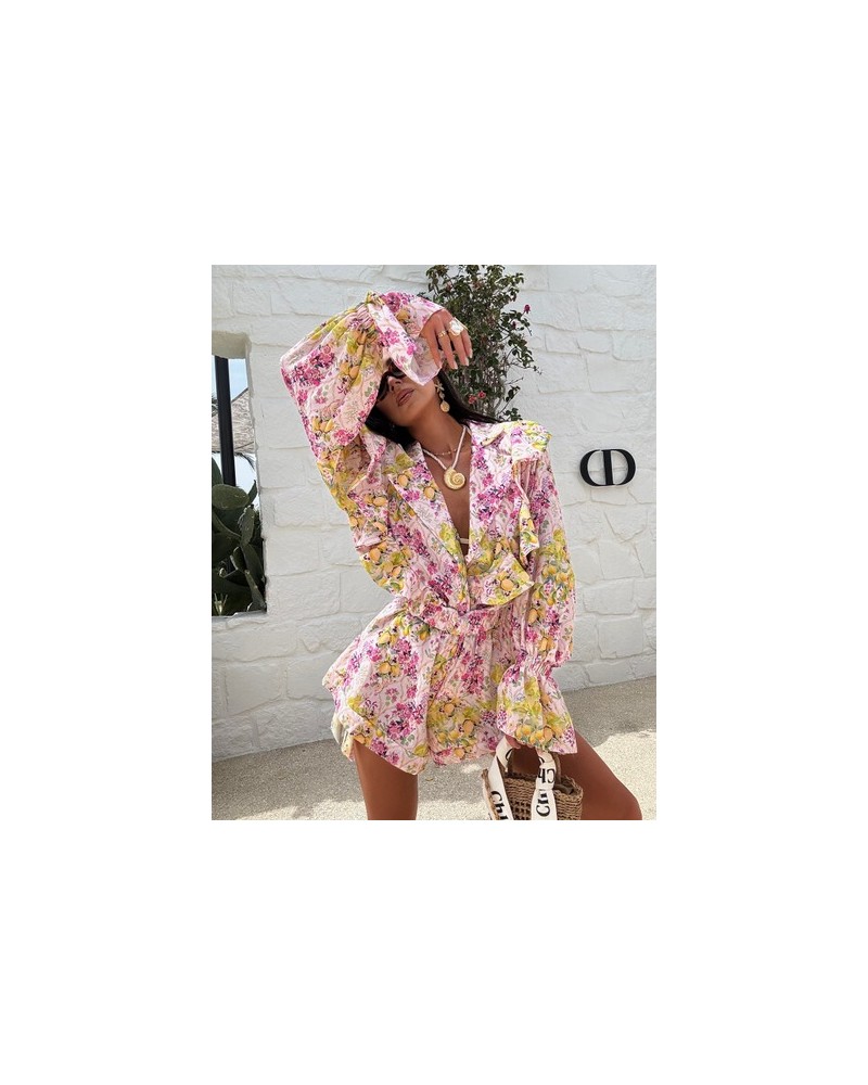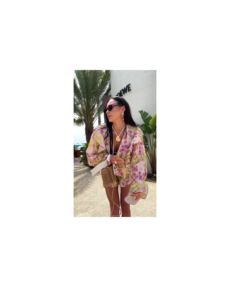 Zestaw La Dolce Vita to kwintesencja letniego stylu i włoskiego klimatu  Zwiewny komplet z delikatnym, romantycznym printem to połączenie komfortu i wyjątkowego designu. Góra z głębokim dekoltem i falbanami przy ramionach nadaje lekkości i kobiecego uroku, a elastyczne szorty z wyższym stanem pięknie podkreślają talię