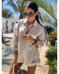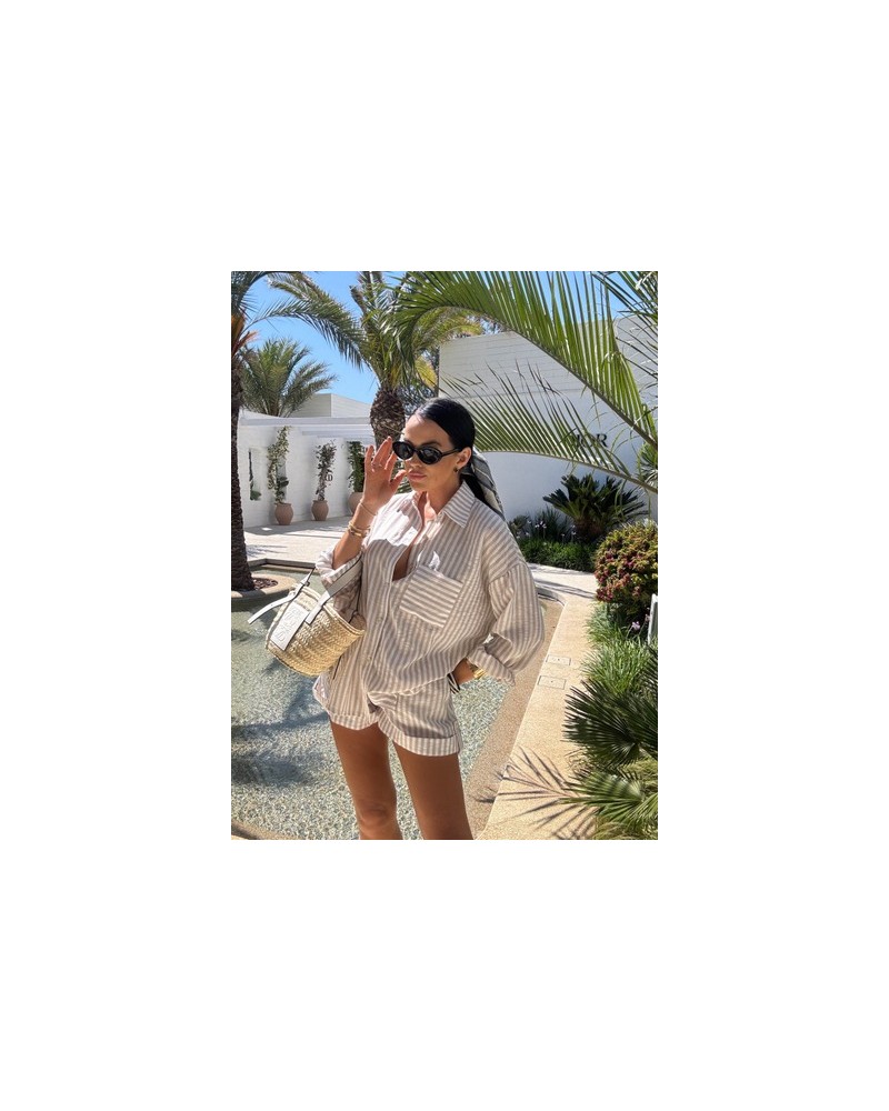 Ten wakacyjny zestaw składający się z koszuli i szortów w ponadczasowe paski to doskonały wybór na ciepłe dni 🌞 Wykonany z lekkiego, przewiewnego materiału, zapewnia komfort noszenia nawet w upalne lato.