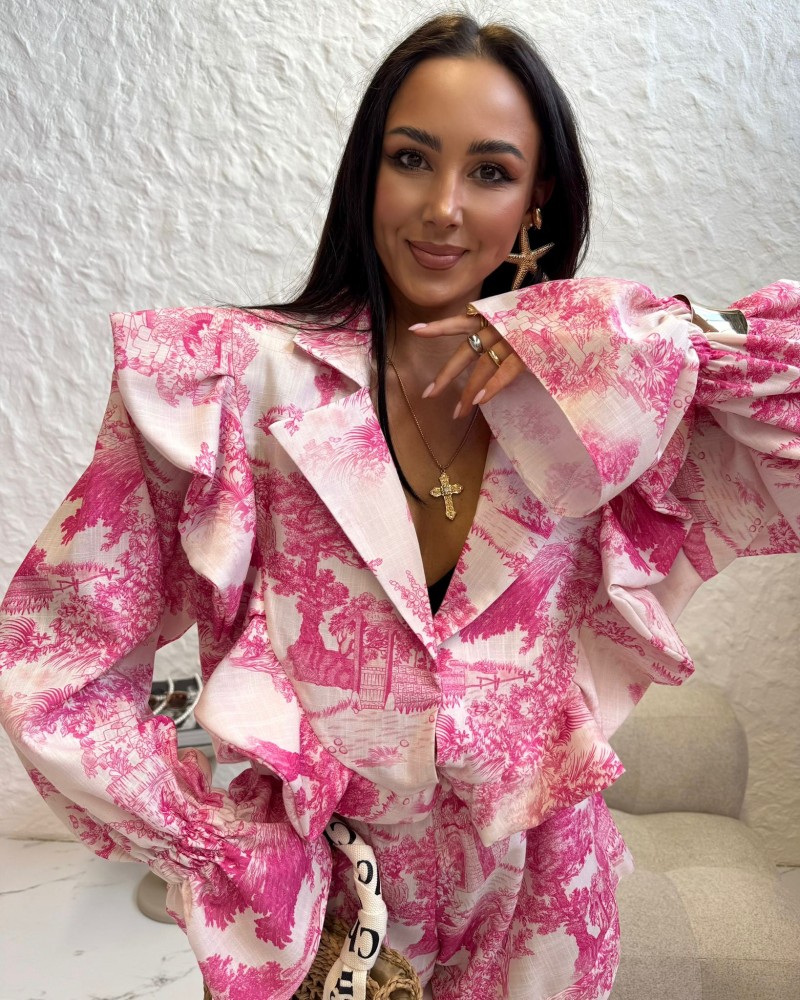 Ten kobiecy zestaw to idealna propozycja dla miłośniczek stylu boho i romantycznych, wakacyjnych klimatów  Bluzka z efektownymi falbanami i szerokimi rękawami dodaje lekkości i wyjątkowego uroku, a luźne szorty z elastycznym pasem zapewniają komfort noszenia przez cały dzień