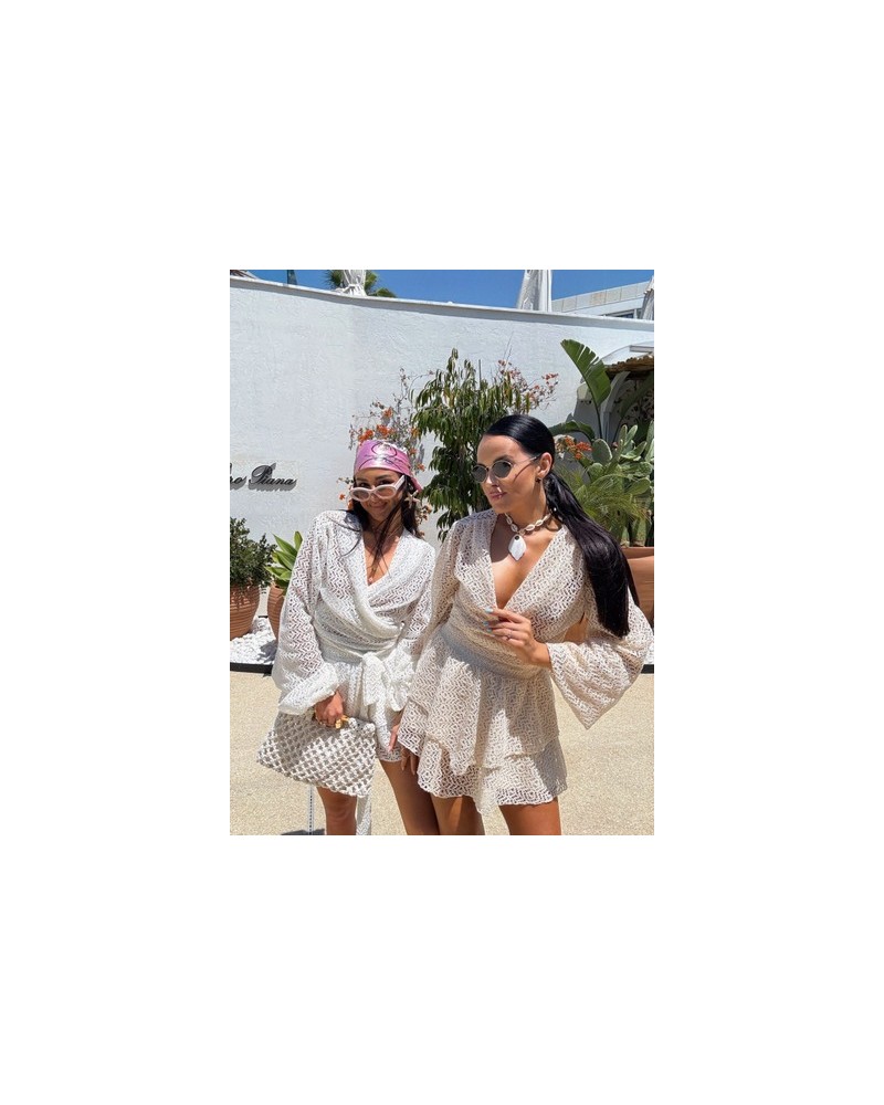 Ażurowa sukienka z wiązaniem i szerokim rękawem  Idealna na plażę, lato i wakacyjne stylizacje