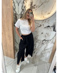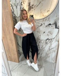 Stylowe spodnie o nowoczesnym kroju z efektownym rozcięciem na nogawce to must-have w każdej szafie!  Dzięki elastycznemu pasowi zapewniają pełen komfort noszenia przez cały dzień, a lekko rozszerzana nogawka z subtelnym rozcięciem dodaje im oryginalności i lekkości  Świetnie sprawdzą się zarówno w casualowych, jak i eleganckich stylizacjach. To doskonały wybór dla osób ceniących wygodę, ale i modny wygląd