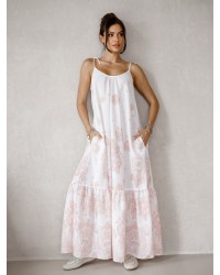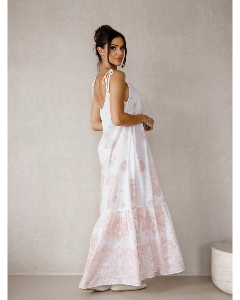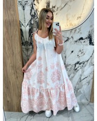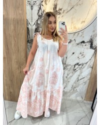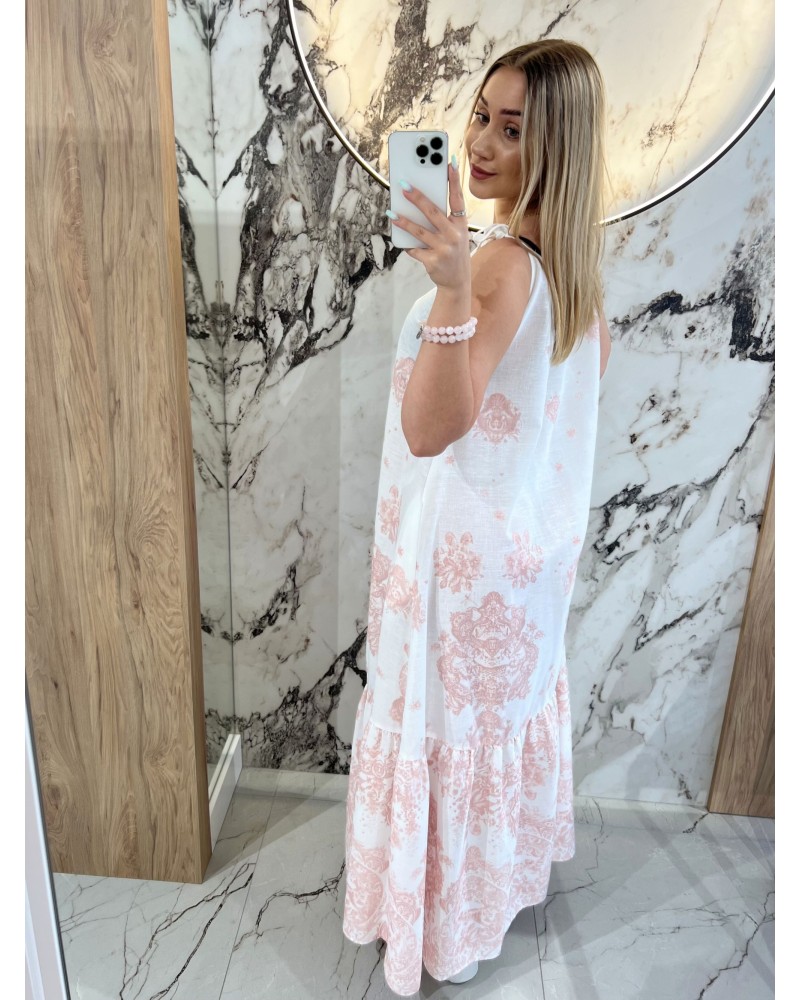 Poczuj lekkość i kobiecy urok z tą wyjątkową sukienką na ramiączkach! Ta luźna, zwiewna propozycja z subtelnym, dekoracyjnym wzorem to idealny wybór na lato, spacery po plaży lub romantyczne wieczory na tarasie . Delikatne wiązania na ramionach dodają uroku i pozwalają na regulację dopasowania, a rozkloszowany krój z falbaną u dołu zapewnia swobodę ruchów i efektowny wygląd .