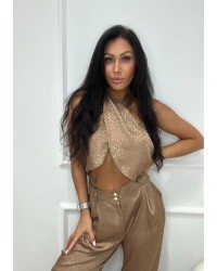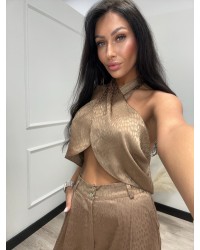 Zachwyć latem w tym modnym komplecie dwuczęściowym, który łączy wygodę z kobiecym lookiem! Elegancki, skręcany top odsłaniający ramiona pięknie podkreśla sylwetkę, a lejące spodnie z wysokim stanem wydłużają nogi i zapewniają swobodę ruchów