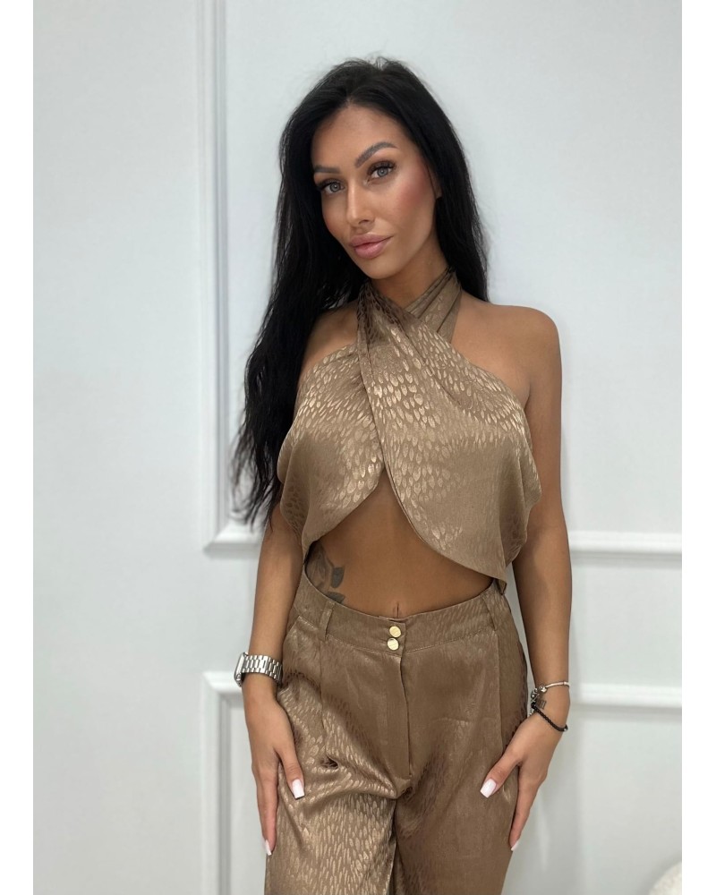 Stylowy, letni komplet dwuczęściowy z efektownym topem i szerokimi spodniami – idealny na wakacje, imprezy i letnie wieczory