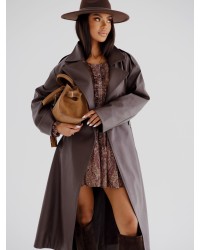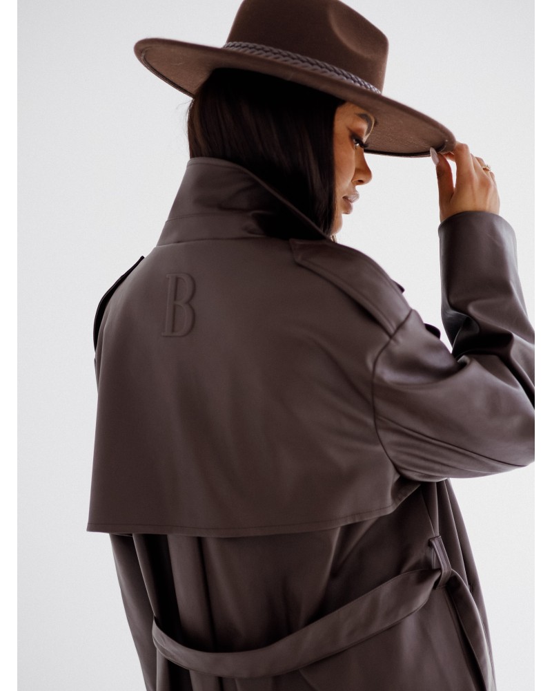 Stylowy trencz z ekoskóry o klasycznym kroju z paskiem w talii. Idealny wybór na sezon przejściowy, łączący elegancję z nowoczesnym akcentem.