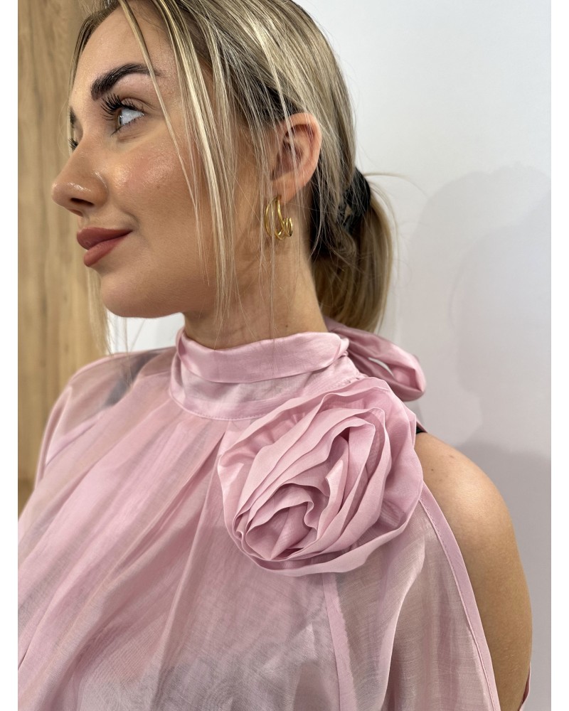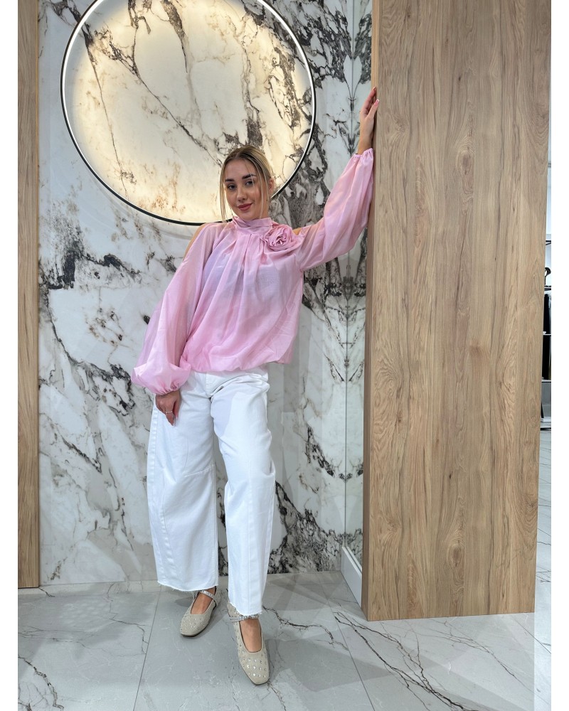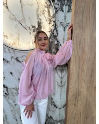 Zachwyć wyjątkową stylizacją dzięki tej efektownej bluzce z wyciętymi ramionami . Model ten łączy w sobie subtelną elegancję i odrobinę ekstrawagancji – bufiaste rękawy, finezyjne marszczenia oraz dekoracyjna aplikacja w formie dużego kwiatu dodają charakteru każdej stylizacji