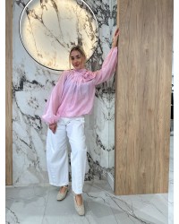 Wysokie zapięcie pod szyją i lekki, przewiewny materiał sprawiają, że bluzka pięknie się układa i świetnie prezentuje zarówno z jeansami, jak i bardziej eleganckimi spodniami czy spódnicą